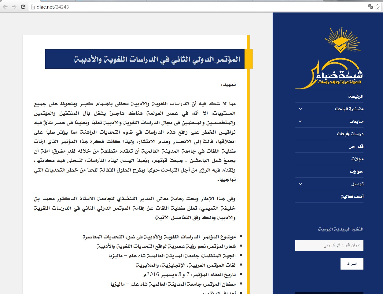 رابط الإعلان عن المؤتمر في الموقع الإلكتروني لشبكة ضياء للمؤتمرات والدراسات