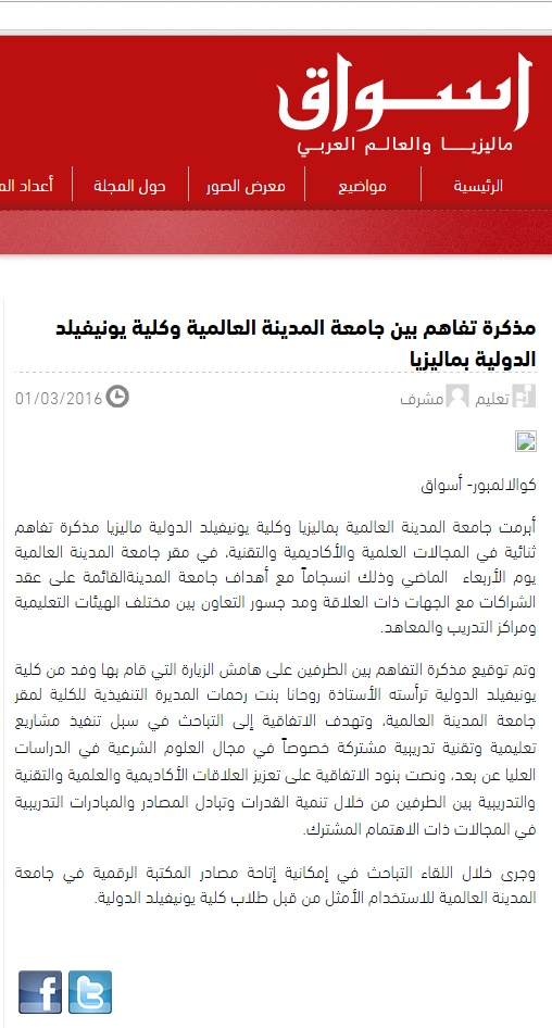 مجلة أسواق تنشر خبر توقيع مذكرة تفاهم بين جامعة المدينة العالمية وكلية يونيفيلد الدولية بماليزيا