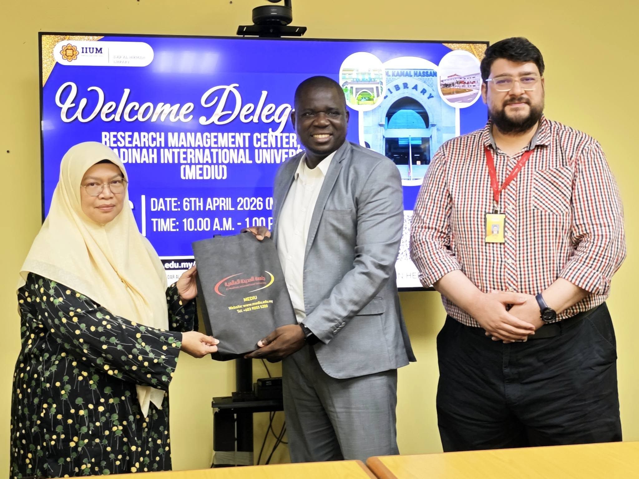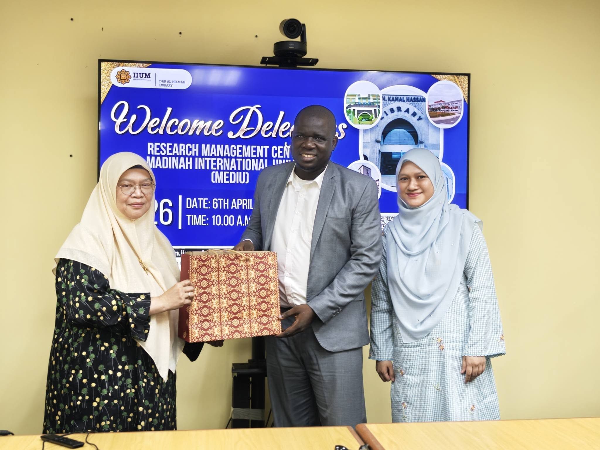 وترأس الوفد الدكتور بوبيولا كريم، مدير مركز البحث العلمي في جامعة المدينة العالمية، حيث كان في استقبالهم وفد من الجامعة الإسلامية العالمية في ماليزيا ممثلاً بمدير مركز البحث العلمي الدكتور المهندس أحمد فاضل بن إسماعيل، إلى جانب عدد من المختصين والباحثين في المجال.